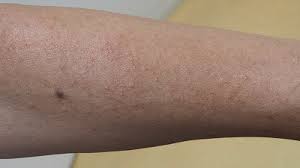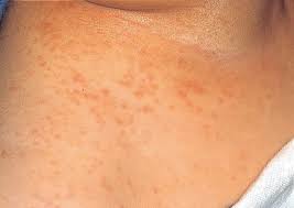 가장 가벼운 형태로, 투명하거나 하얀색의 작은 물집이 생기며 통증이나 가려움은 거의 없음. - 홍진 (Miliaria rubra)