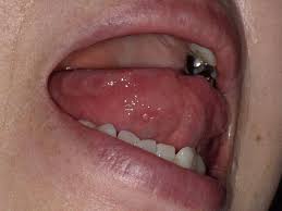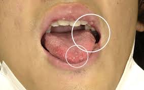 - 혀에 작고 둥근 궤양이 생기며, 가장자리가 붉고 중심은 흰색 또는 노란색을 띰
