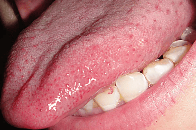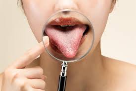 - 칸디다증: 혀 표면에 흰색으로 두꺼운 백태가 끼고 벗겨짐